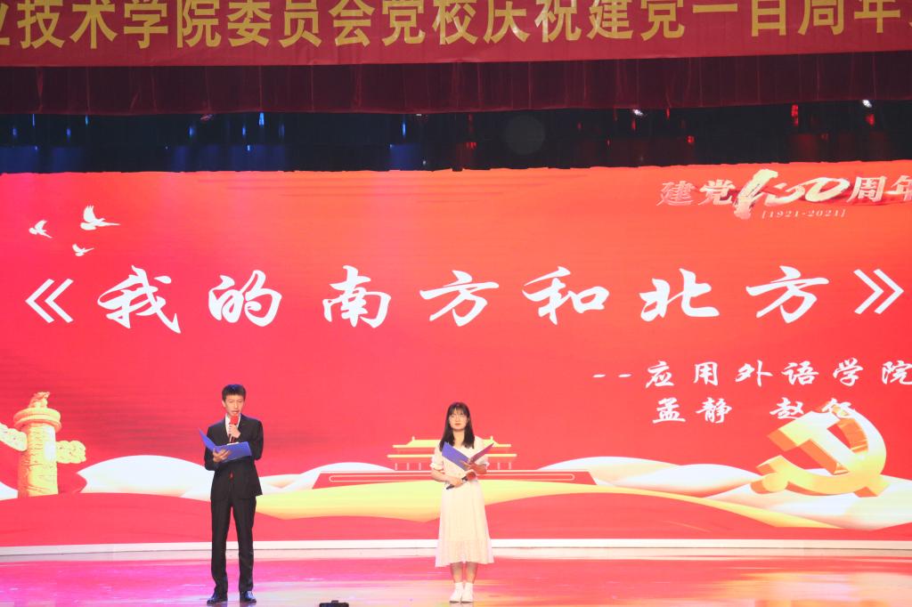 晚会在建筑工程学院和网络工程学院的大合唱《传唱百年风华》拉开序幕;党校宣传部与社会实践部的舞蹈《Youthful girls》洋溢青春的活力;应用外语学院的朗诵《我的南方和北方》抒发了对祖国的热爱和殷切期盼;生物工程学院的小品《阳台》表达了对抗疫一线的工作者深深的敬意;党校社会实践部的独唱《勇气》令人陶醉;党校组织部的红色电影配音《传承先烈遗志,共筑强国盛世》撼动人心;材料工程学院的大合唱《我们走在大路上》和生物工程学院的舞蹈《浪人琵琶》让观众直呼精彩;党校纪检部的话剧《五四运动破晓》让我们回想起那个可歌可泣的岁月;最后在党校合唱团合唱的《强国一代有我在》歌曲中落下帷幕。